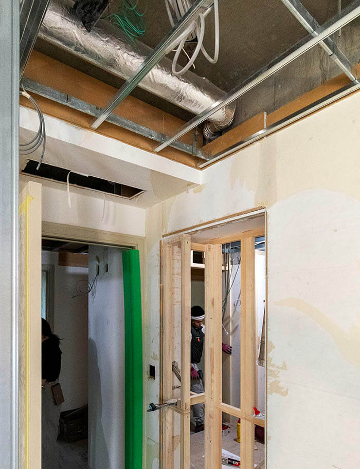 玄関ホールの天井は以前よりかなり上がって、モールディングも取り付けられて堂々とした空間になってきました。