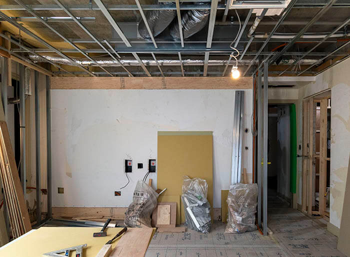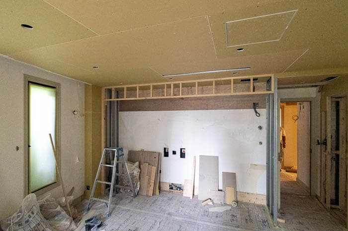 リビングはそれほど変わっていませんが、キッチンとダイニングは天井が張られて、床と壁が組みあがってきています。