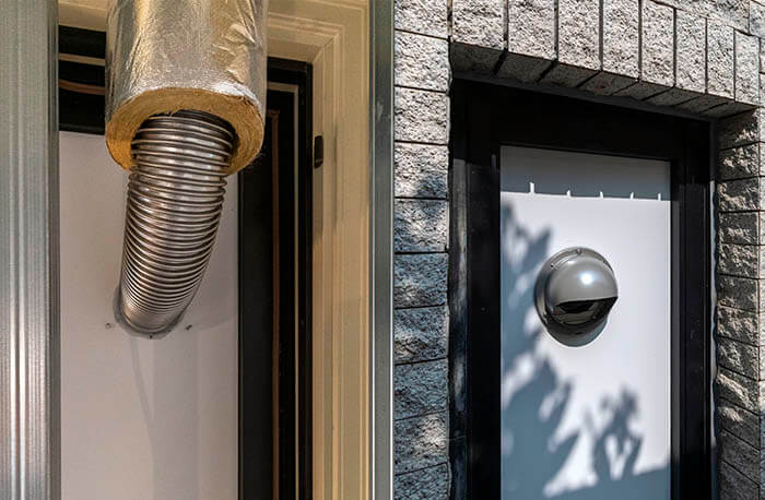 ちょっと判り難いですが、木軸の壁を作っているちょうど背面に乾太くんが設置され、そこから天井裏に新しくコア抜きした穴を貫通してシルバーに防護された排気ダクトが主寝室の天井裏に通っています。