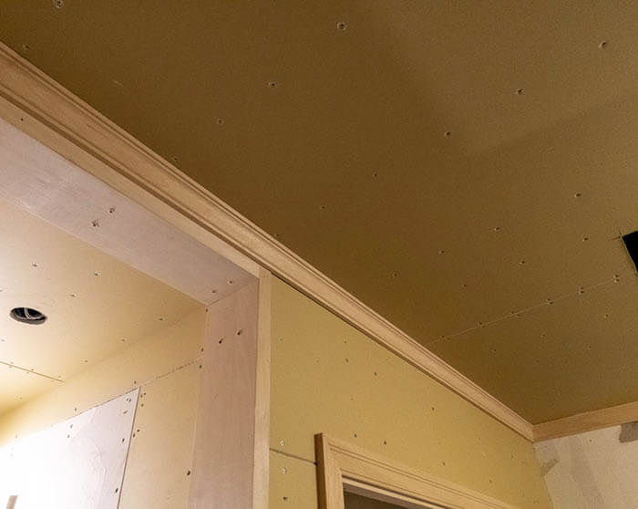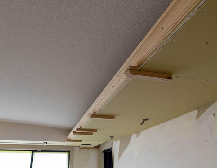 リビングは折り上げ天井の間接照明のアゴ部分のモールディングの取り付け中でした。