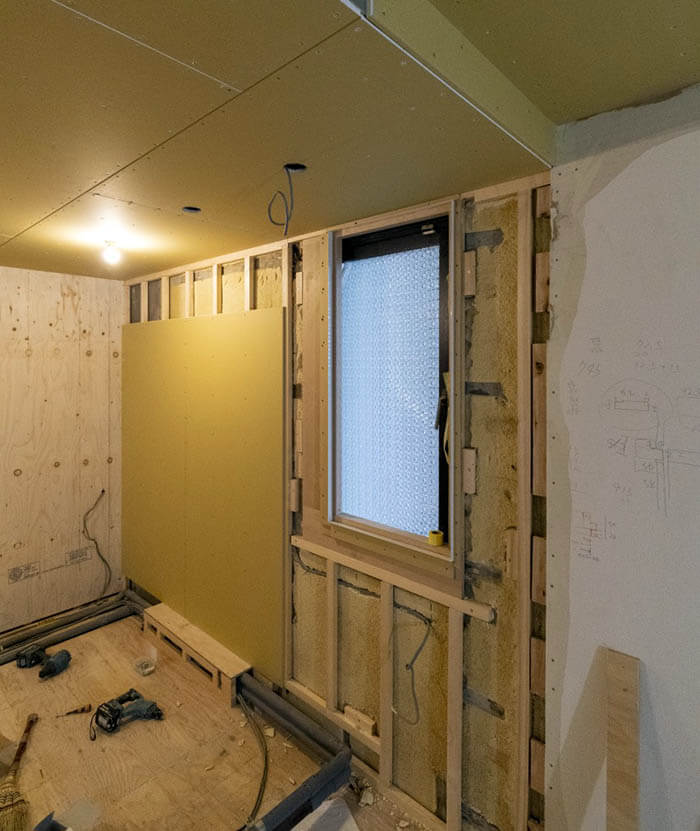 以上のことを考えて、既存の窓の手前に壁とフラットになるガラス窓を取り付けることになりました。手前のガラス窓に乳白のフィルムを貼って明り取りにする計画です。