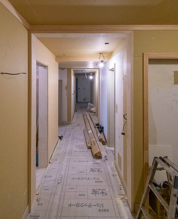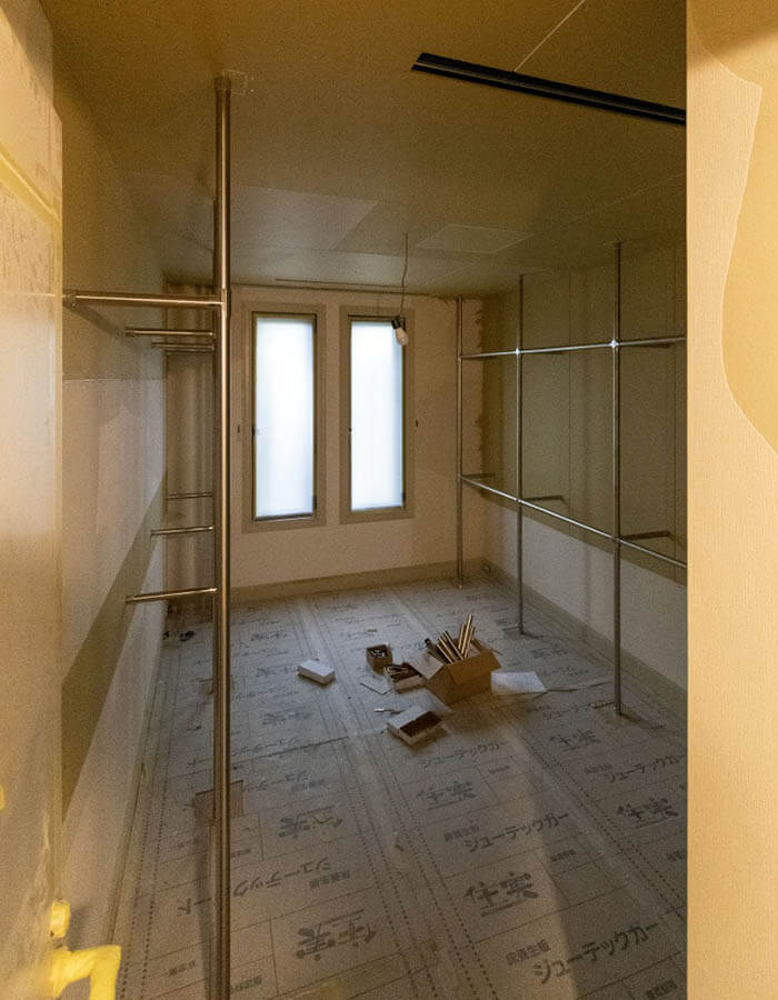 こちらは主寝室の様子です。壁付けクローゼットを新たに設けて、そのクロゼット部分の天井裏に、新しく設けたランドリールームからガス乾燥機の乾太くんの排気を接続する計画になっています。