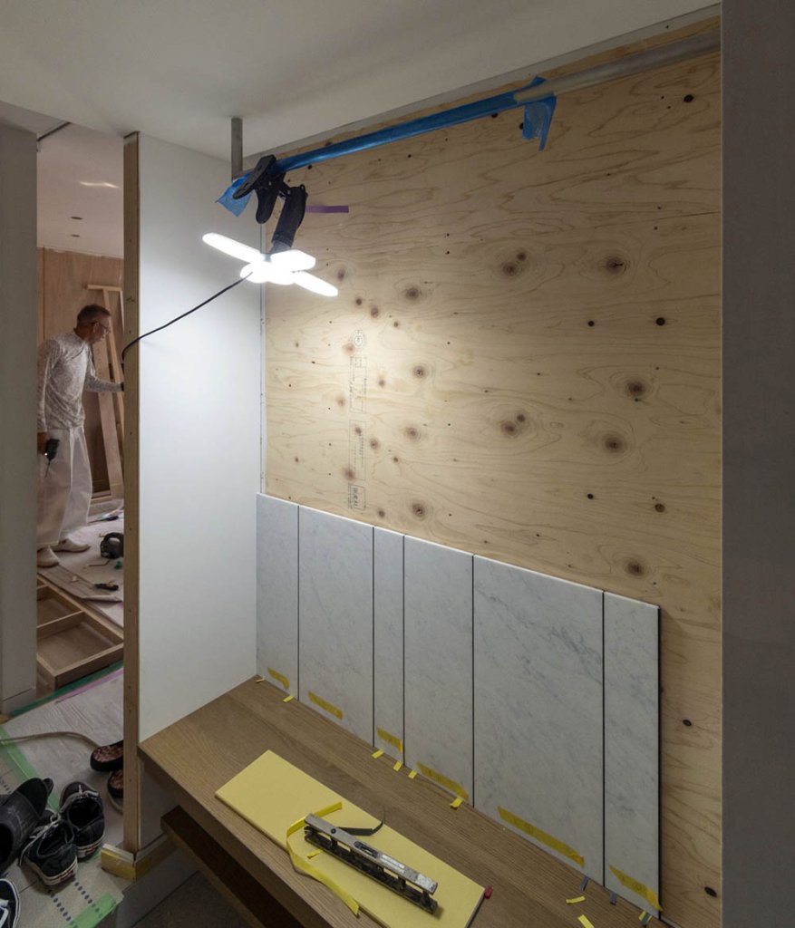 壁塗装の直前には、玄関壁の加工大理石のサルバトーリ張りも進んでいます。今回採用したのはワザとザラザラに仕上げた白系大理石のビアンコカラーラと黒い金属の目地棒を交互に張るタイプのトラッティです。