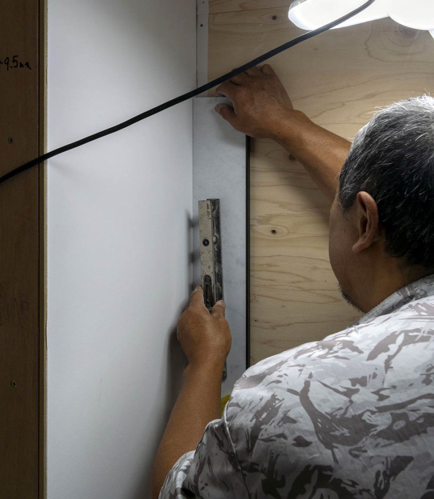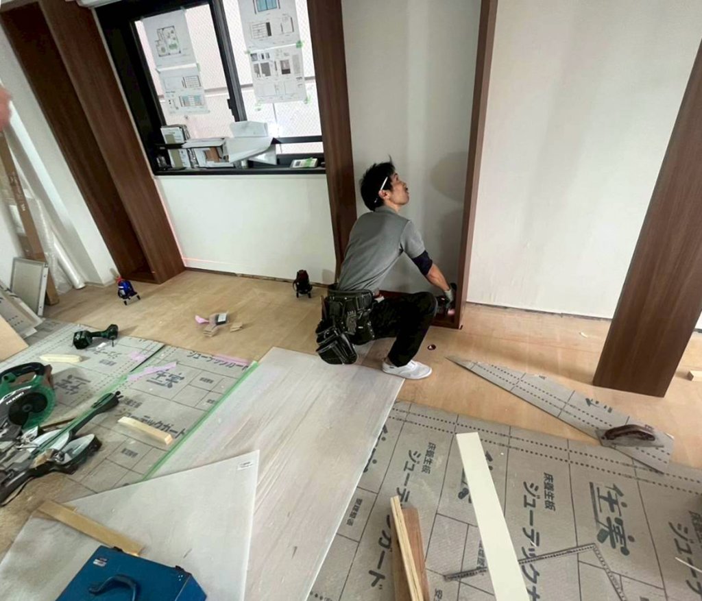 大工の小野寺さんたちが、平行や直角がきちんととれていない現場寸法に合わせて微調整をしてくれています。