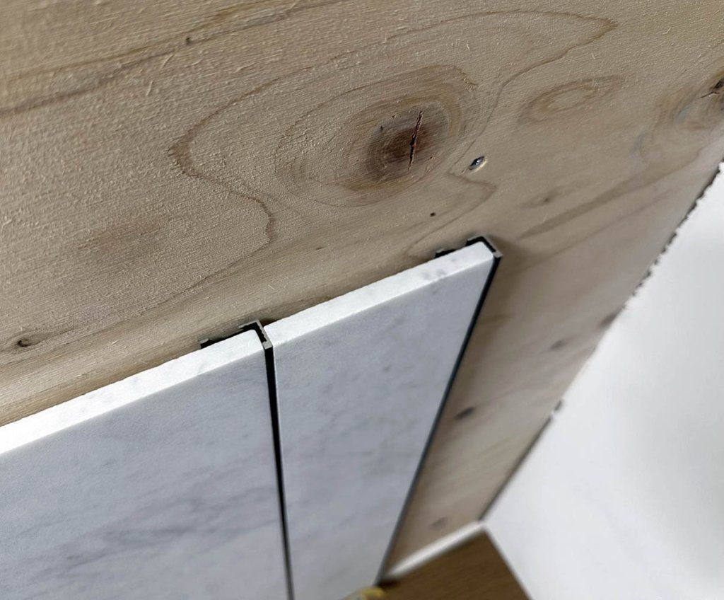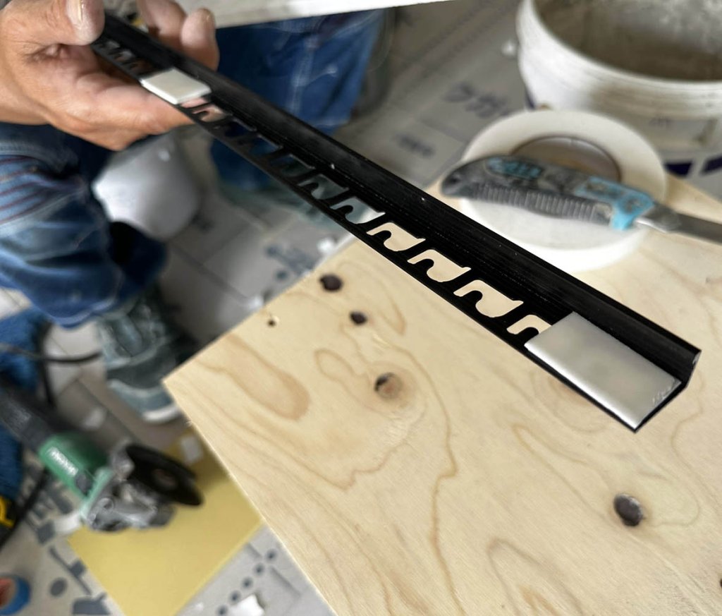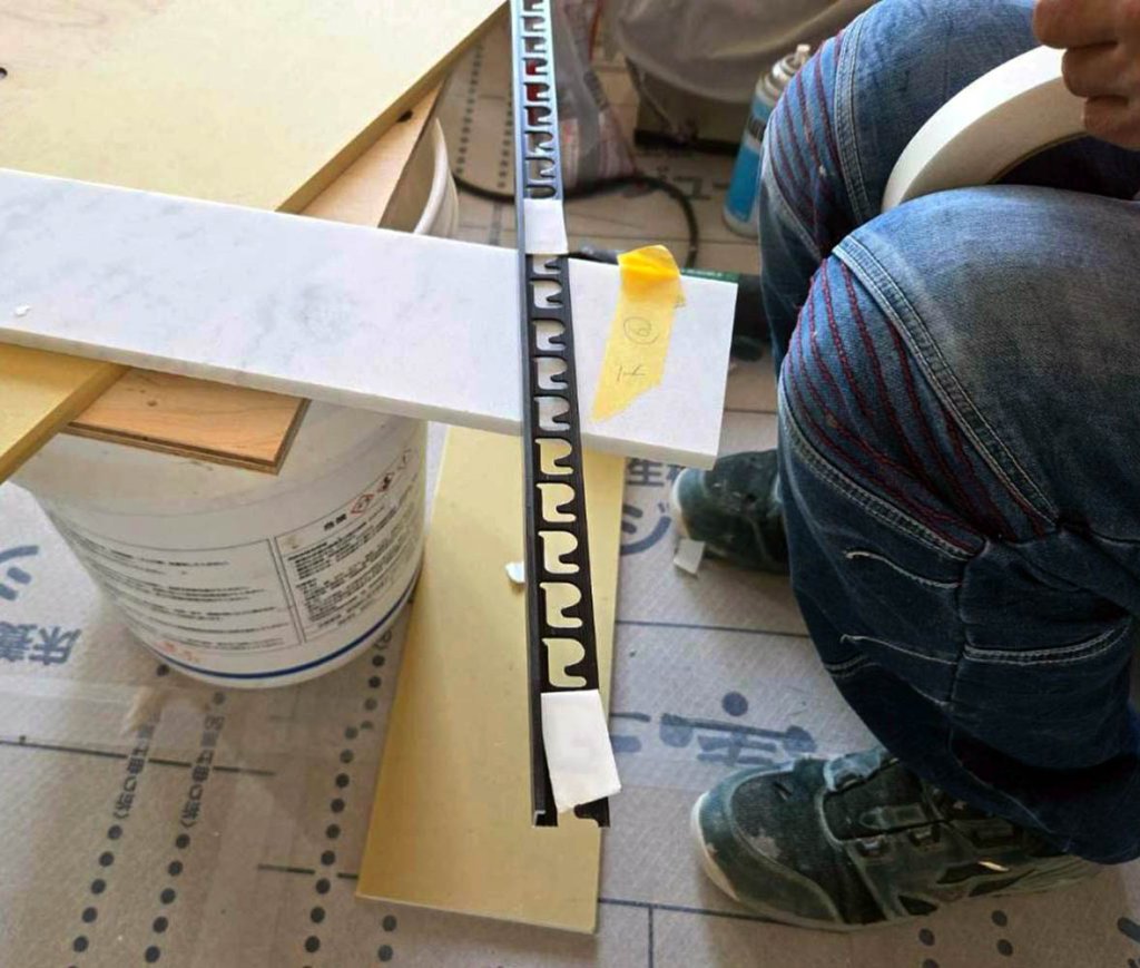 なぜか大理石の厚みと金属の目地の厚みがズレているので、目地棒に厚み調整為の両面テープを張ってもらい、大理石+目地棒のセットを作ってもらい、それを順番に張ってもらうようお願いしています。
