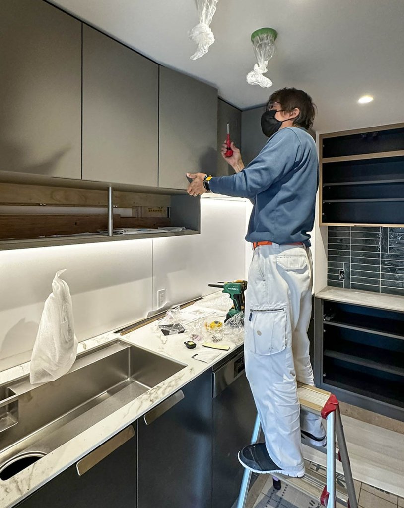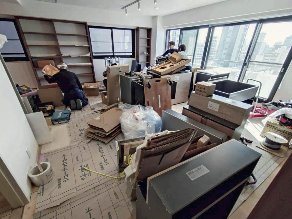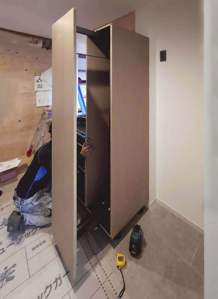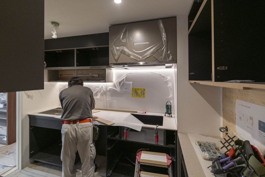 次はキッチンの組み立てとなります。因みに、造作家具やキッチンといった現場組み立てがある工事は、実際に組み上げる場所の3~4倍ほどのスペースが必要だと言われています。