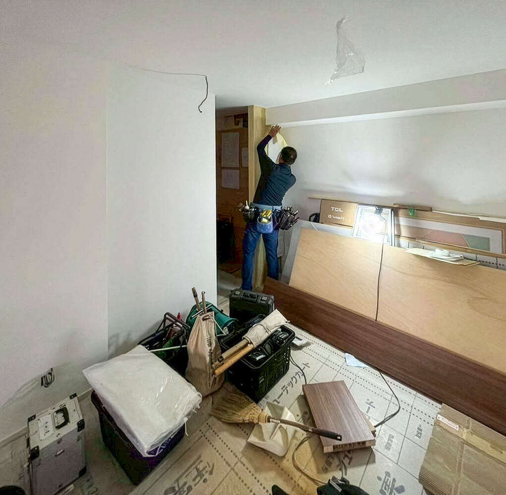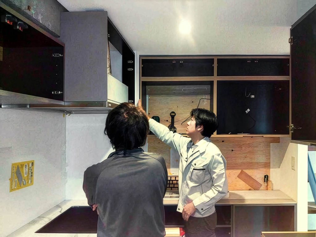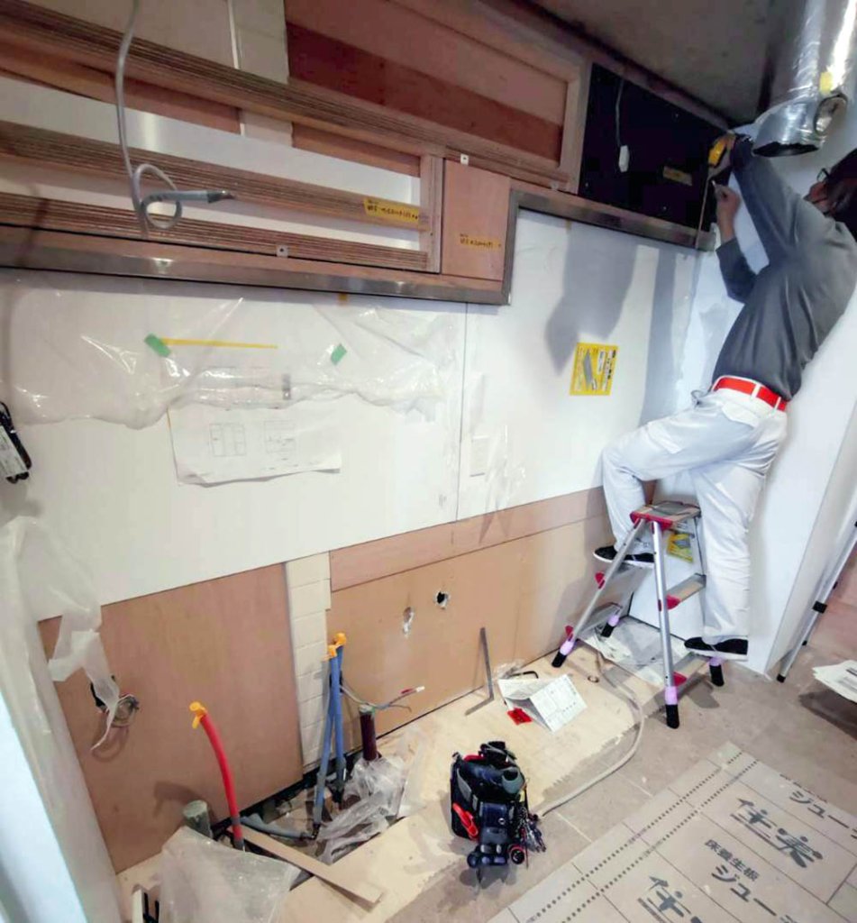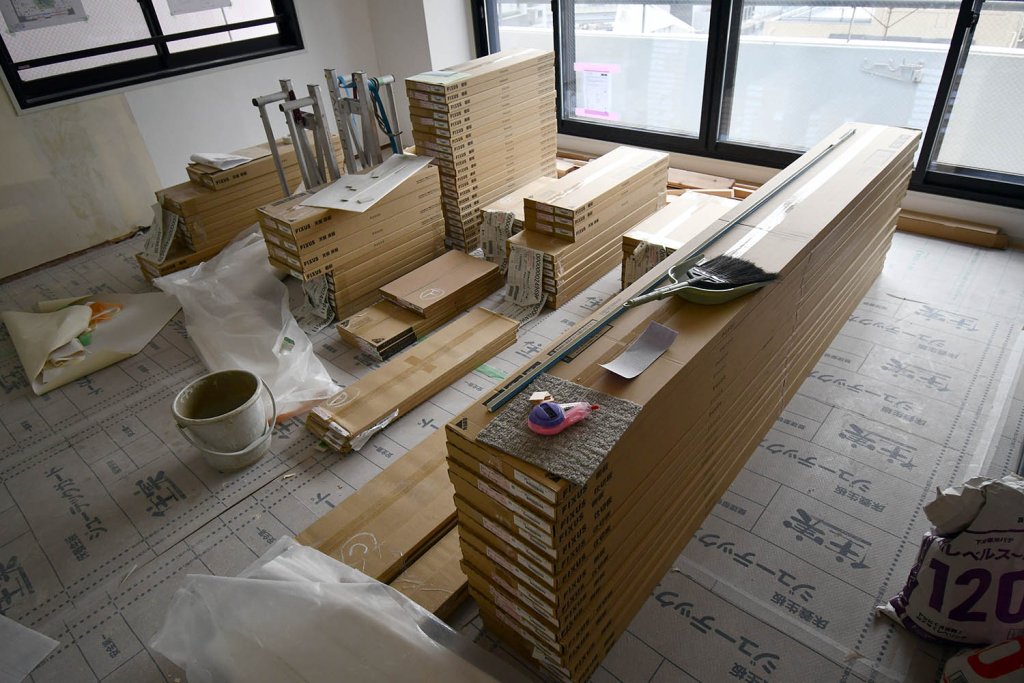 次はキッチンの組み立てとなります。因みに、造作家具やキッチンといった現場組み立てがある工事は、実際に組み上げる場所の3~4倍ほどのスペースが必要だと言われています。