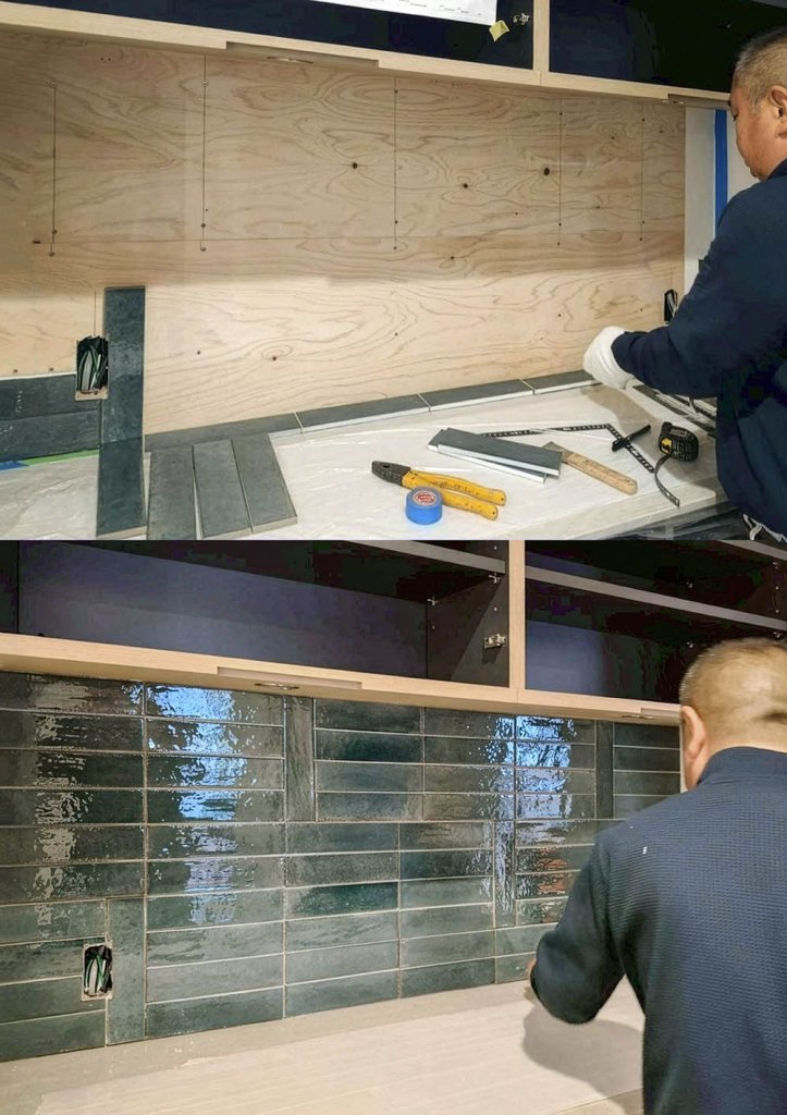 ここまでできたところで、一旦キッチン組立作業は空けて貰い、側面セットの立ち上がり壁部分にマラッツィ社のカラフルなタイルのルーメをデザイン貼りしてもらいます。因みに、デザイン貼りした理由は所々に縦のタイルを貼ることで、タイル面のサイズ調整をして、カットするタイルの枚数を減らしているのです。