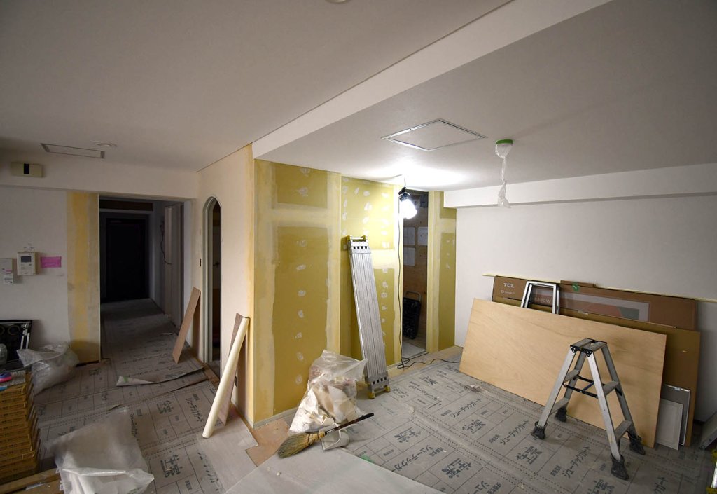 以前は壁で仕切られていた小部屋をかつてのLDに合体させたこと、またキッチンにも新しい開口を作っているので、それなりのクロス張り作業がありました。
