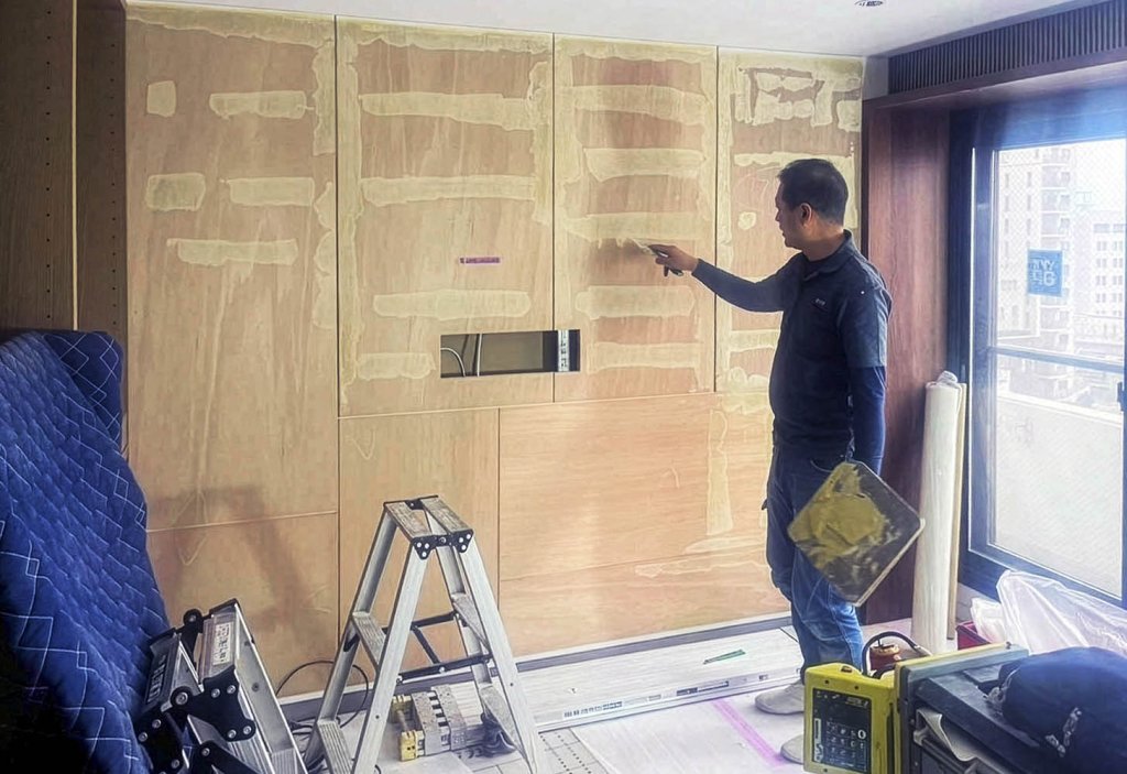 打ち合わせ室にテレビを設置する壁は、クロスのパネル貼りとしているので、クロス屋の清水さんがパテ作業をしてくれています。