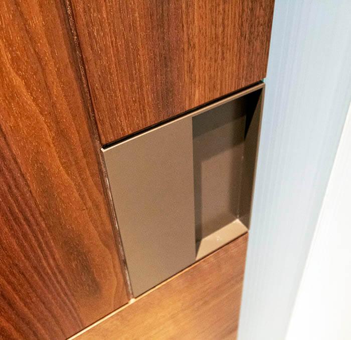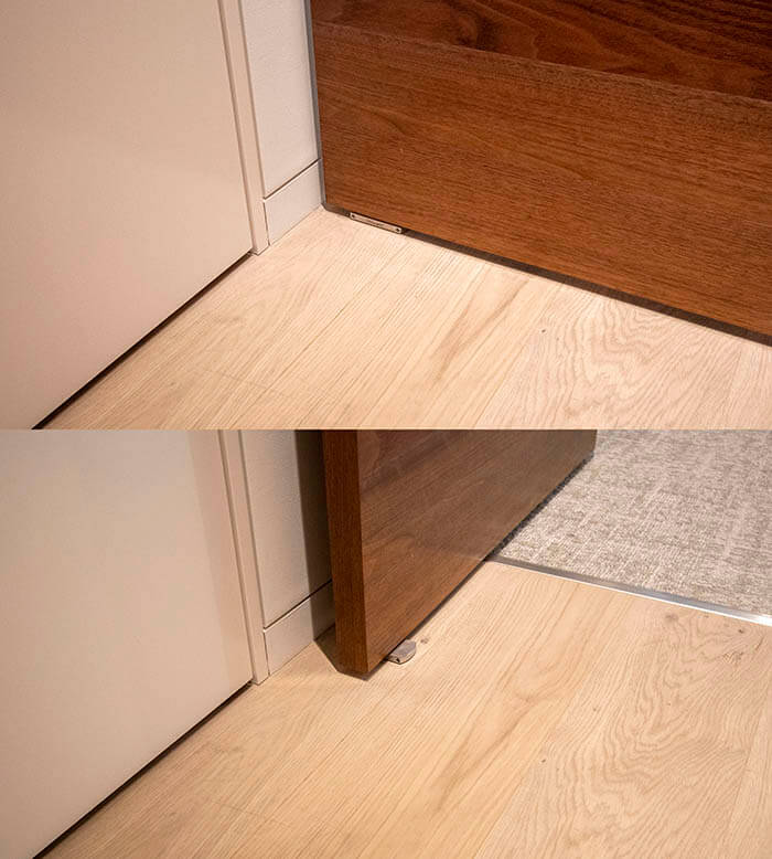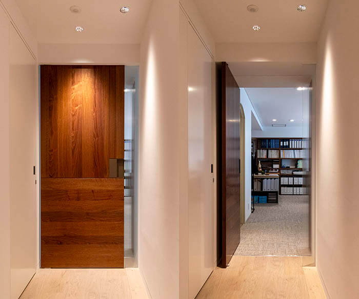 まずはこちらの廊下から事務スペースへの開き扉からご紹介します。ウォールナット突板張り建具をフロアヒンジを使ったピボット扉として収めています。普通の開き扉は枠と丁番(ちょうばん・ちょうつがい)を使いますが、フロアヒンジの場合、枠も丁番も不要となります。