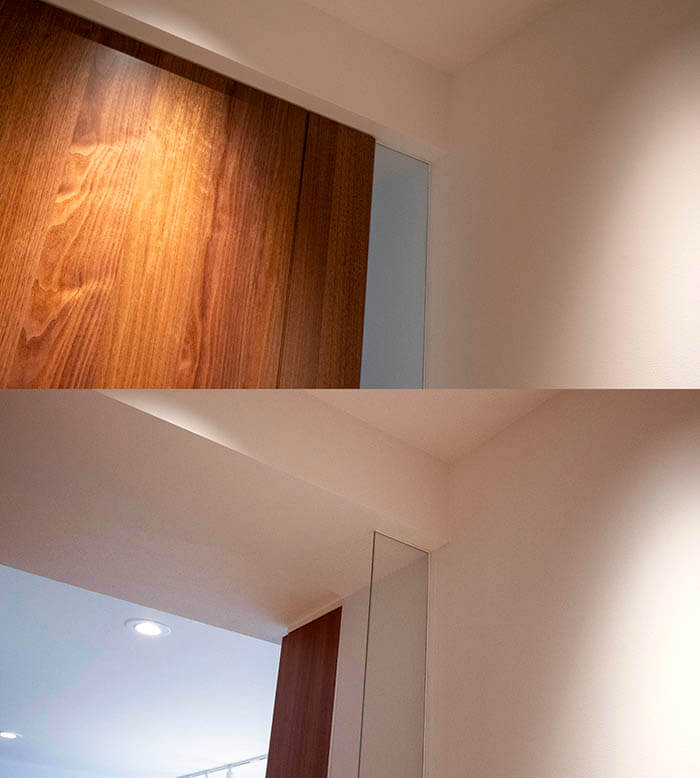 戸先(トサキ)側のアップ写真を見ると分かりますが、枠が無い為、扉が開いた時に空間が繋がって見えます。戸先側に明り取りのガラス袖壁を作っていますが、ここにも枠が無いのが良く分かりますね。