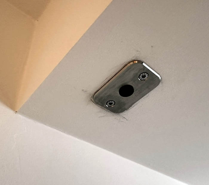 天井にもやはりシンプルな軸受け金物が取り付けられています。下部金物と上部金物の位置関係はかなり精密に合致していないと建具が歪んでしまうので、レーザーを使って厳密に設置する必要があります。