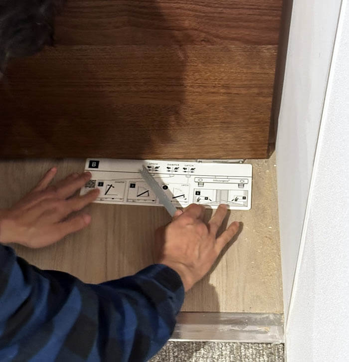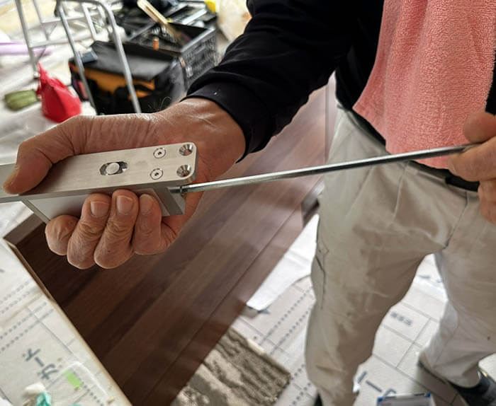 建具の吊り込みが終わった後でも、この型紙を当てて、吉岡さんが右手に持っている金具を位置に合わせて差し込んで左右にまわせば、建具を外すことなくスピードなどを調整することができるという訳です。