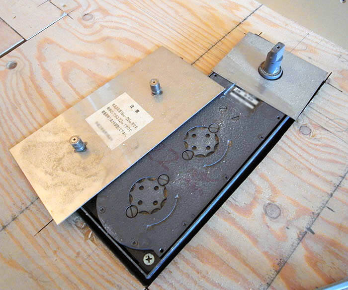 先ほどフロアヒンジの素晴らしいメリットを書き連ねましたが、実はこれまでのフロアヒンジの施工上の大きな問題は、床下を掘って、この写真のような大きなバネ付きの箱を埋め込む必要があることでした。床下に箱を埋め込む寸法的な余裕があることは必須の条件で、かつこのヒンジの発注はかなり早い段階にしないといけないので建具のサイズや重量を計算する必要があったり、床仕上げ材の厚みなども早めに決めないといけないという問題がありました。