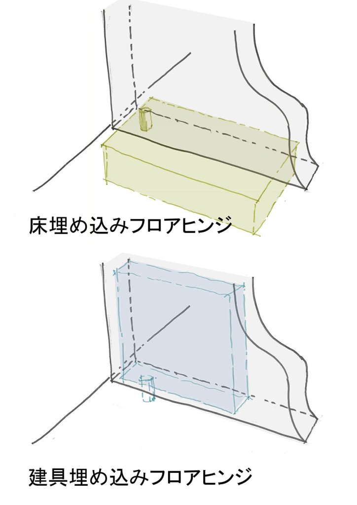 簡単に図解すると、薄緑色の床埋め込みタイプのフロアヒンジと薄青色の建具埋め込みタイプのフロアヒンジの違いは、このようになります。床に埋め込まないのに、フロアヒンジと呼べるのかという疑問は多少残りますが…。