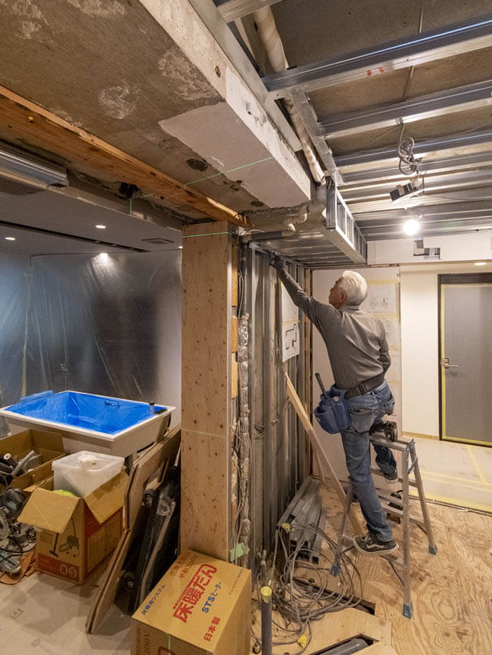 大工の宮永さんがキッチン下地の手直し工事をしている様子で、左側に見えるのが作業スペースです。