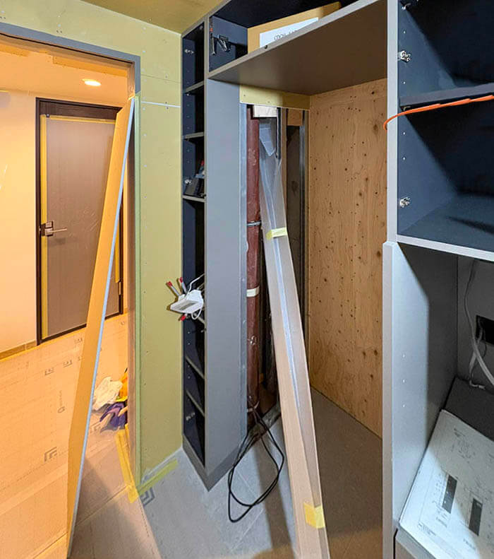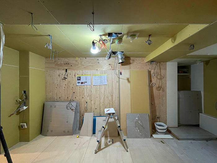 奥の浴室は東京バススタイルのオーダーユニットバスです。既に防水パンから壁パネルが入り浴槽を設置するためのエプロン(浴槽手前の腰高の壁)も立ち上がっています。
