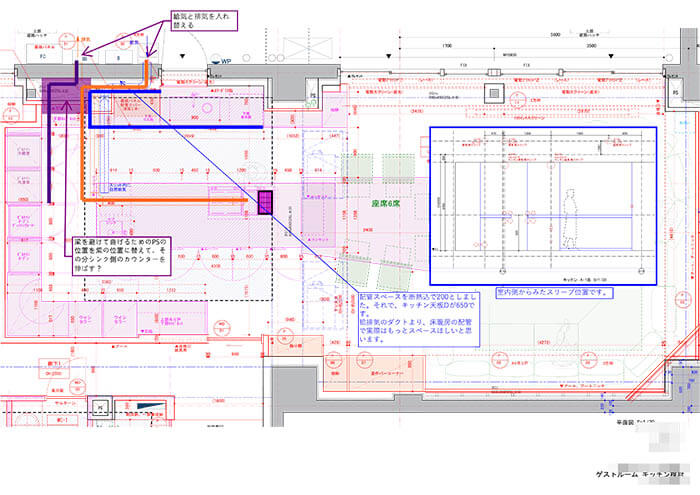 こちらの図面が調査に同席してもらったモルテーニ側とも調整しながら天井裏のダクトルート(排気経路)とても気にっていらしたを検討中の図面です。これまでにカガミ建築計画で設計したキッチンでも最大級サイズのキッチンになりそうです!