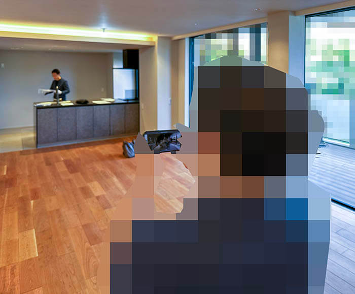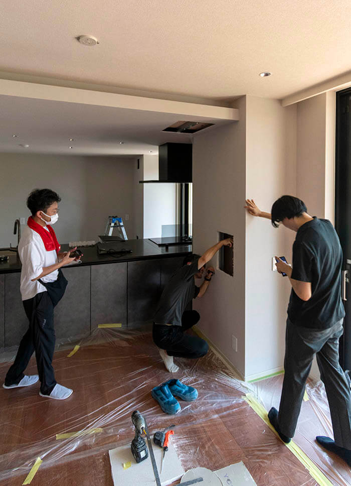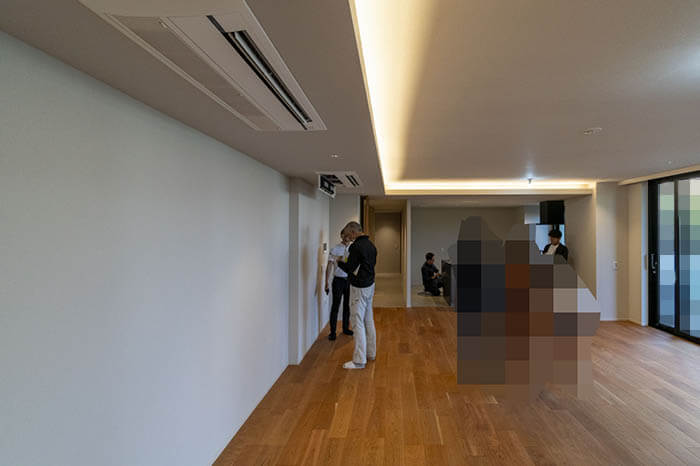 CGでリノベーション後のイメージのお話をしている間も、リフォームキューの営業&設計の坂本さん、設備の槻川原さんたちは、エアコンの品番は点検口からの覗ける壁裏や天井裏を調べてくれています。