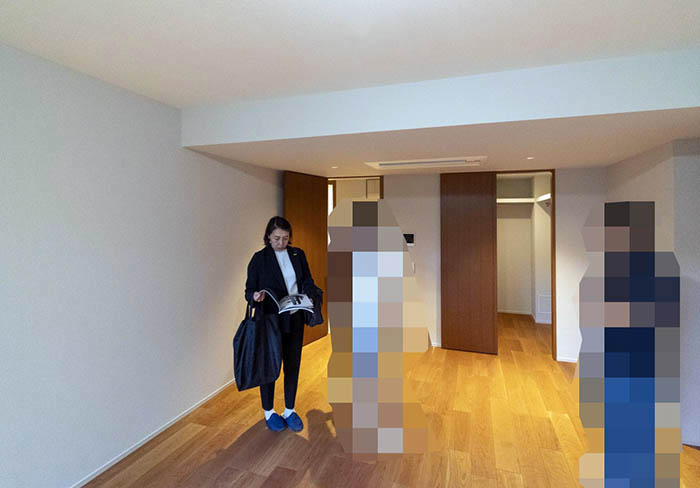 奥の個室が2つ連なったエリアは、ご家族で使えるトレーニングジムになさりたいとのことで、テクノジムの小山さんに現地に来てもらい、簡単に機器の説明をして貰いつつ、どのサイズの機器であれば搬入設置が可能かも現地確認して頂きました。