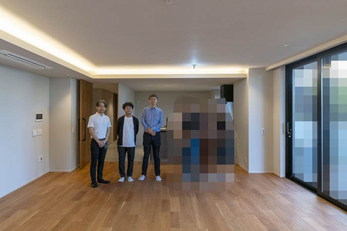 Rさまの携帯のアップの写真です。この、いかにも“新築らしい”(失礼!)単調な空間が、ここまで濃密な空間にリノベーションで生まれ変わるのかと、Rさまも“本当にこうなるの?”と半信半疑ながら、目を輝かせて興奮されているご様子でした