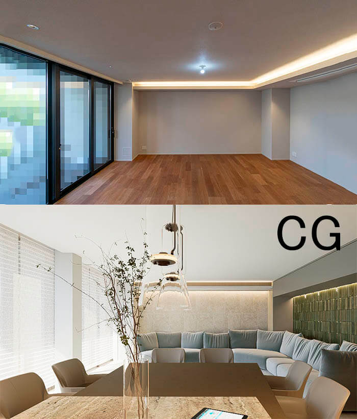 因みにこちらが事前に前田君が図面と仕上げ材のサンプルイメージから事前に作ってくれていた竣工時(つまりリノベーション前)CGです。細かく見比べると、コンセントやカーテンボックスなどが違っていますが、お客さまもこのCGと現地を見比べながら、前田君のCGの再現力に驚いていらっしゃいました。