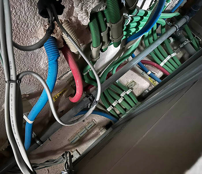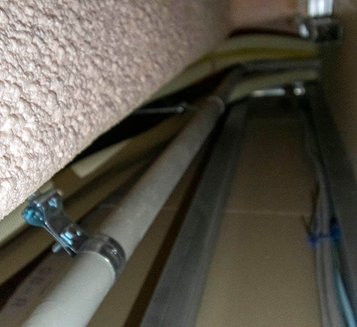 もう一か所、既存のキッチンと奥の個室の間にかなりのサイズのPSがあったので、そちらも内部を見させてもらったところ、給湯器への給水(水色の管)と電気配線(灰色の線)、給湯機からのお湯(赤い管)と床暖や追い炊き用のペアチューブ(緑のチューブ)、そしてキッチンの排水管がありました。