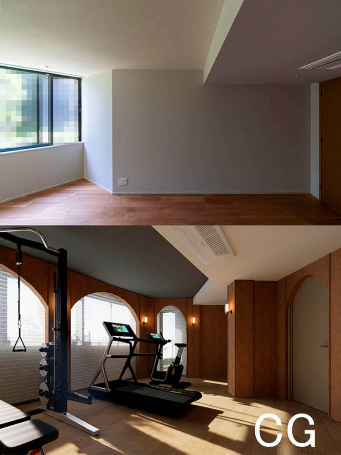こちらが2室の間の間仕切り壁を抜いて、一体化させた部屋にテクノジムのトレーニング機器(まだ機器の選定はしていないので、適当に選んだだけです)を並べてみたイメージCGです。