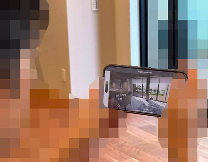 そして、この日の為にビフォーアフターのCGを用意していたので、Rさまの携帯で見比べながら、この新築マンションがどのように変わってゆく予定かを見比べて頂きました。