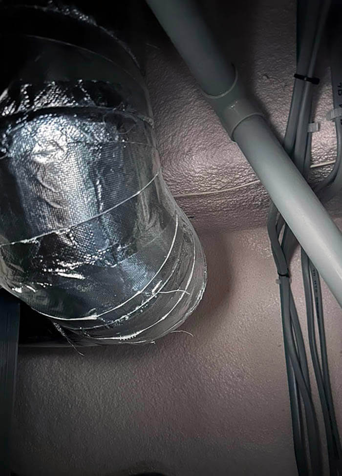 同じPSの上部には、既存キッチンの排気ダクトが通っていました。天井裏に隠れていた梁型を避けるためにここで折れ曲がっていました。ただ、ちょうど中間の部分は見事にスペースが開いていることが分かったので、カウンター下と吊り戸形状の梁型を作れば、キッチンカウンター部分を広げることができそうです。