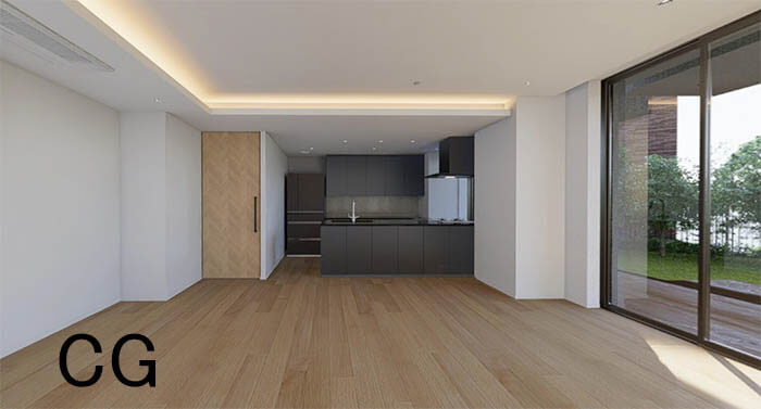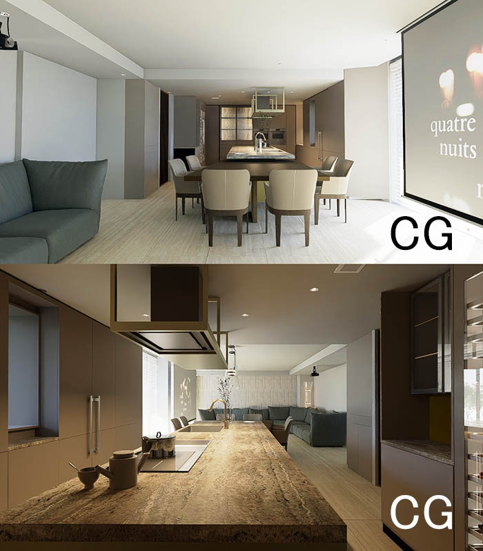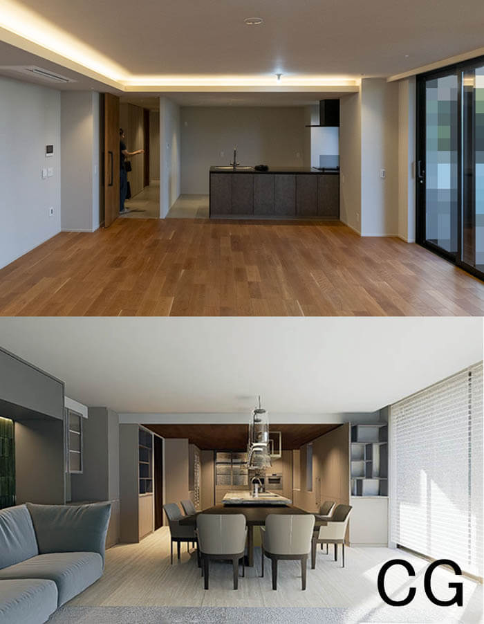 ほぼ同じアングルで竣工時写真とCGを見比べた比較イメージです。このCGイメージをご夫妻で確認して頂いた際に、ここまでフィットするのであれば、ゲストハウス住戸のキッチンはモルテーニで決定にしましょうとのご判断も頂きました。