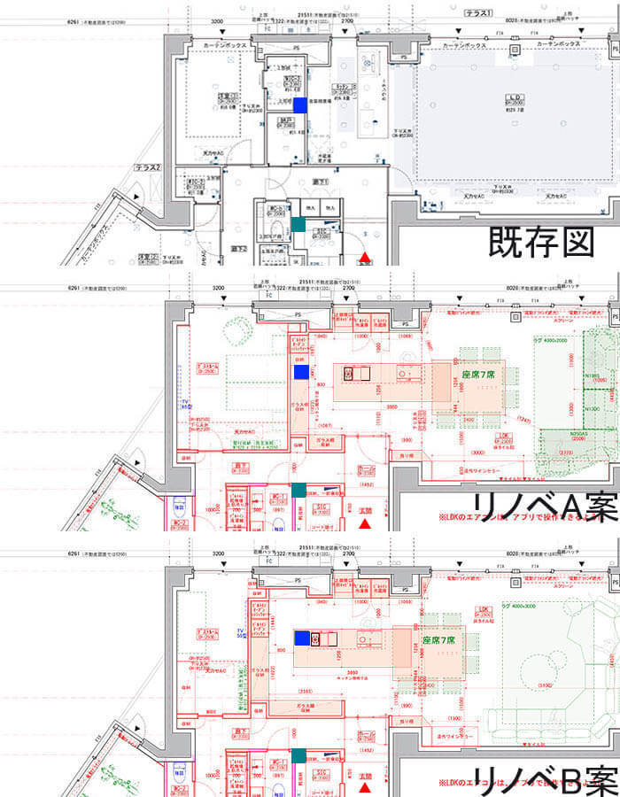 一番上が既存平面図です。180平米の広さに対して3LDKの間取りとなっていました。Rさまと僕らでまず考えた案がリノベA案です。Rさまと僕らで最初に検討したのがリノベA案です。玄関(赤い三角印)から入り、直角に左へ曲がる廊下の位置を変更し、LDKを広げるプランです。図中の青い四角と緑の四角は、マンション共用部に当たるPS(パイプスペース)です。それらの位置を見比べると、各案の違いがより分かりやすいと思います