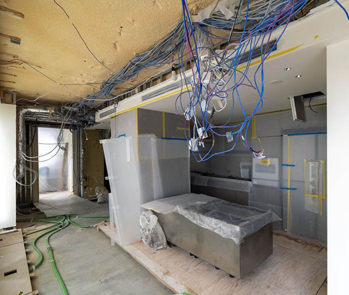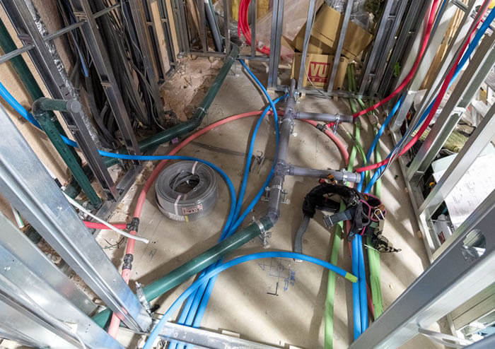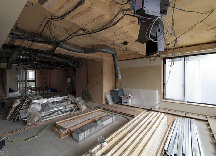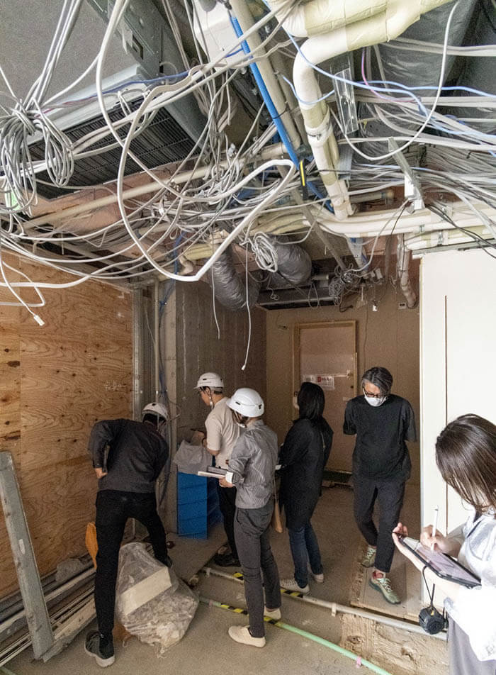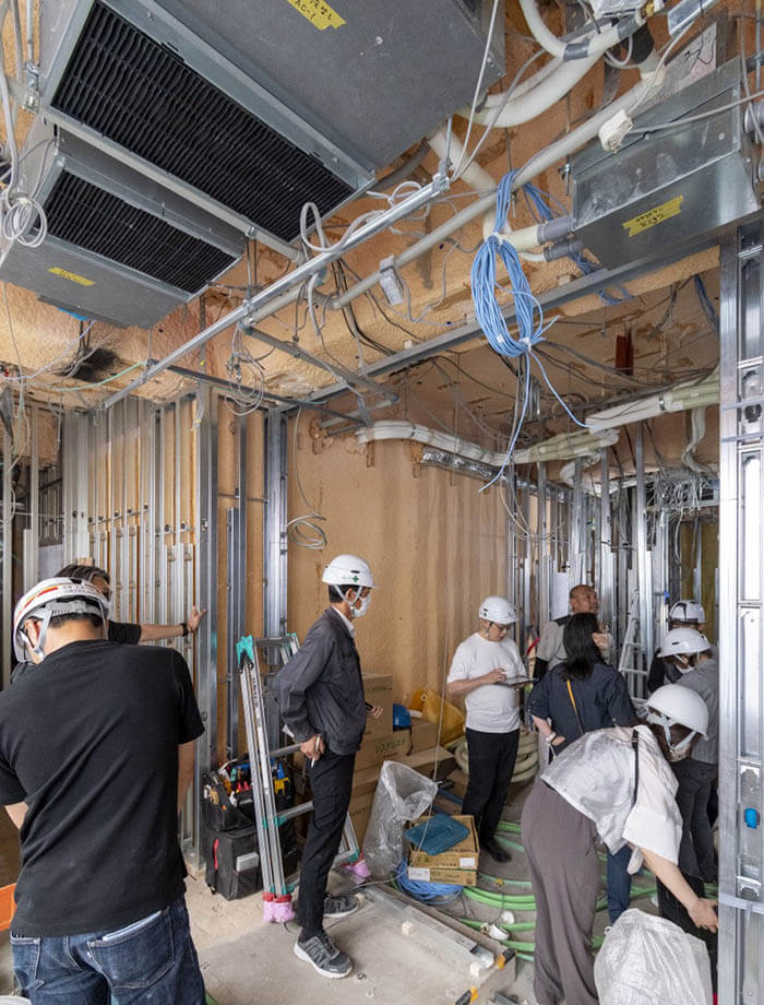 同時に工事進行中の上階と行ったり来たりしながら設備配管や電気配線の状況を確認しています。
