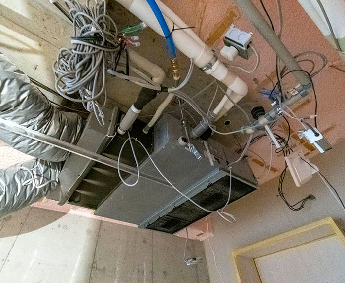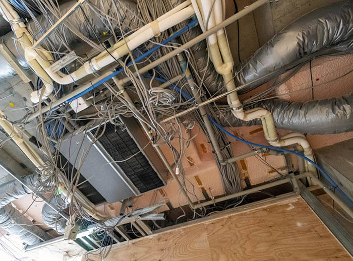 天井裏隠蔽型エアコンを検討する際には、エアコン室内機本体が設置される個所、エアコン本体を点検する点検口とフィルター清掃用の点検口、ダクトのルート、冷媒管とドレイン管の位置、そして将来的にエアコン室内機本体が壊れた時にどのようにして交換するかがチェック項目となります。ここではドレイン管のルートを三井デザインテックの施工チームと、設計チームで確認している様子です。