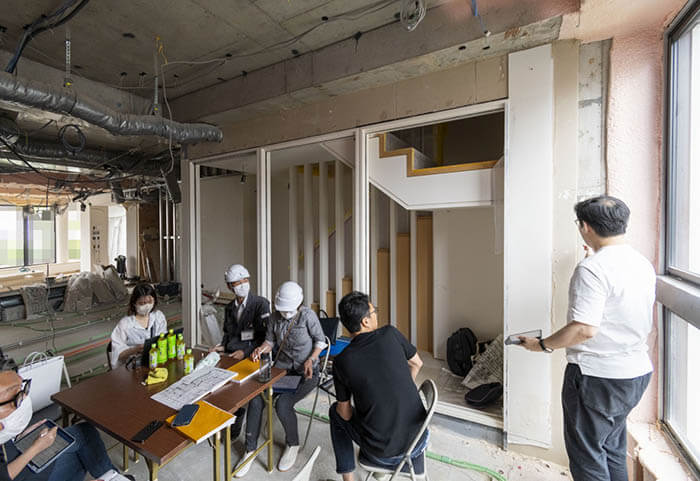 ほぼスケルトン状態の下階の階段横に打合せテーブルを用意してもらい、設計側と施工側で現場定例をしているようです。この室内階段の周囲に防火区画が設けられるので、その取り合いを現場の設計担当の見上さんが説明しれています。