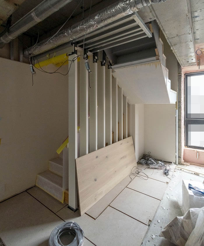 メゾネット上階との行き来に使われるこちらの室内階段だけは残されています。