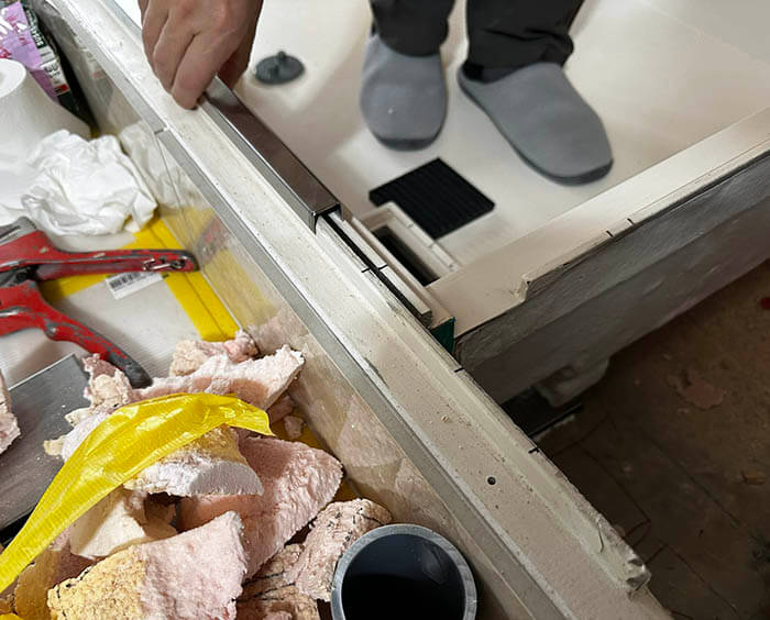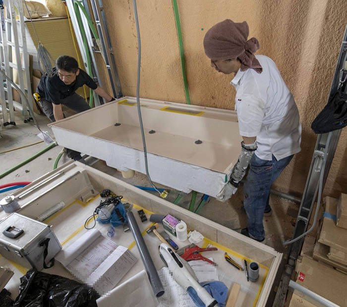 床下に動かせないガス管があったので、変形防水パンで一部を高くした特注のパンをレーザー水平器を使って慎重に設置してくれています。