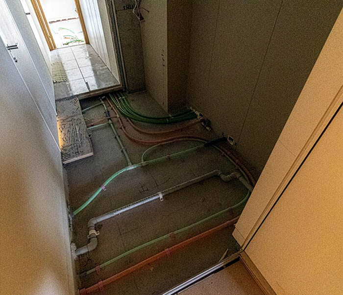 下階の玄関から個室への廊下沿いに新しく手洗いカウンターを設置する箇所は、床大理石タイルを剥がしてスラブの状況と配管を確認したところ、ギリギリ排水管を設置できる余裕があることが判りました。