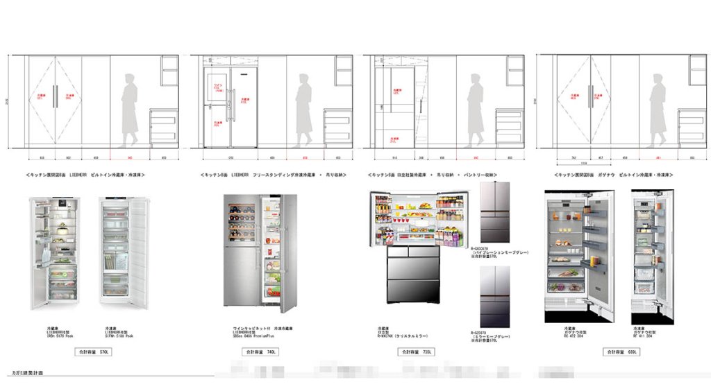 ①はIRBh5170とSIFNh5188(共にリープヘル)を組み合わせたもので合計容量は570Lとなります。②はリープヘルSBSes8486単体で740Lとなります。全体容量はあるのですがワインセラーがある分冷凍庫が小さくなります。③は日立のR-WXC74Xで735L。ただし奥行きは①②④と比べて深くなります。④はガゲナウのRC472304とRF411304の組み合わせで合計689Lとなります。