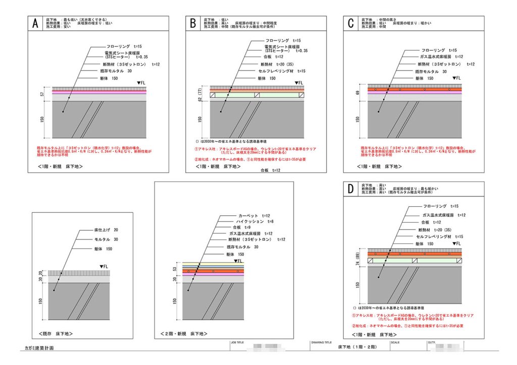 Aが最悪のケースとして既存床下のシンダーコンクリートが上手く剥がれなかった場合は、床暖房の下に断熱材を設けない(因みに既存の床構成がそのようになっていました)場合、Bはシンダーが上手く外れて、セルフレベリング材が15ミリで断熱材を20~35の間で設定して床暖房を電気式シートにした場合、Cはやはりシンダーコンが外れないで12ミリの断熱材を敷いて、ガス温水式床暖房を入れた場合、Dはシンダーを取り去って、ガス温水式床暖房を敷いた場合と各ケースを比較して、床下構成を考えてくれたものです。薄塗りの約25ミリ厚のシンダーコンクリートを撤去できるかどうかは、今の段階では判断が難しいこと(却って厚みがあればパッカー工法が使えるのですが…)、床暖房の熱源をガスにするか電気にするか(条件的にはどちらもできるのです)、そして床暖房下の断熱層の考え方それらの条件に合わせて設定してくれているので、床下についてもある程度の想定ができたのです。