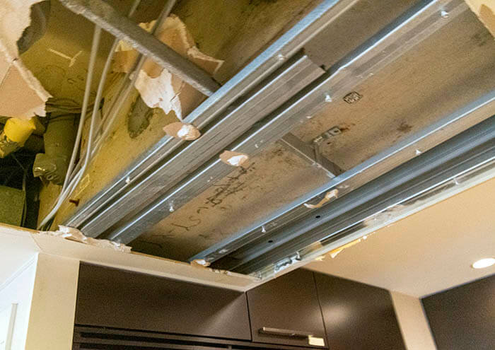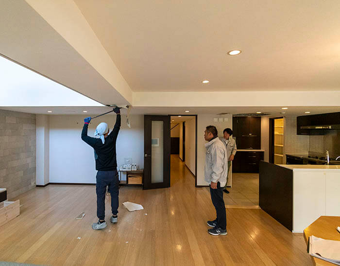 こちらは将来的に冷蔵庫を置く箇所の天井裏を確認している様子です。ちょうど冷蔵庫上に大きな梁が通っているのです。