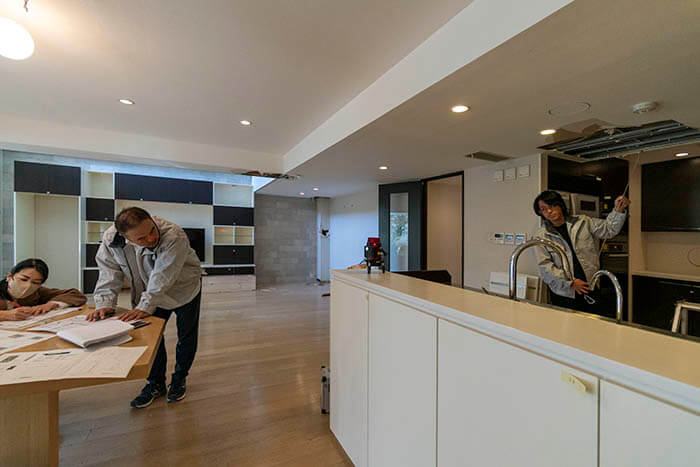 キッチンカウンター上にレーザーを置いて、梁下寸法とシンダーコンの寸法から最大でどれだけの寸法が取れるかを青の片岡社長、現場担当の石坂さん、そして弊社竹田さんの3人で測量してくれている様子です。