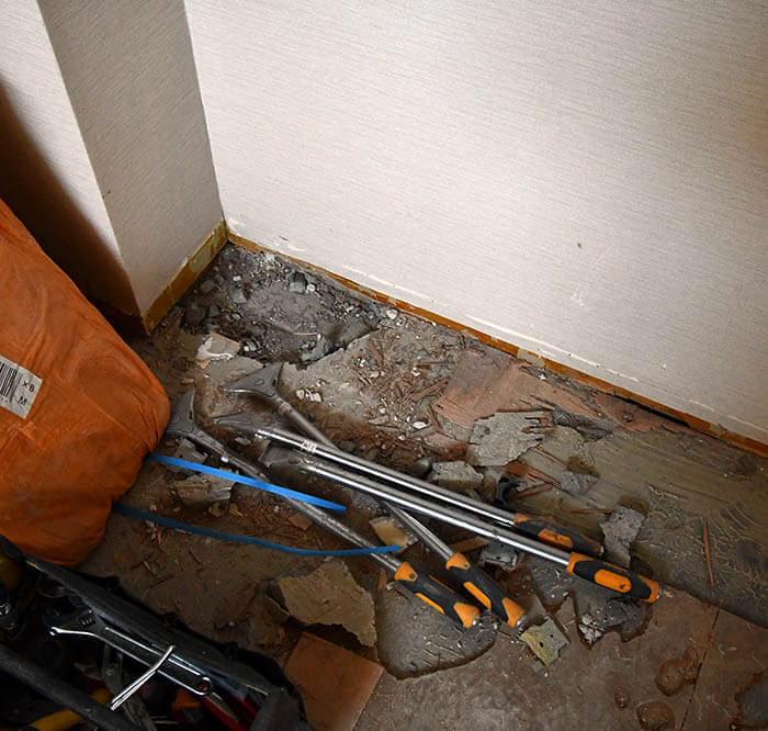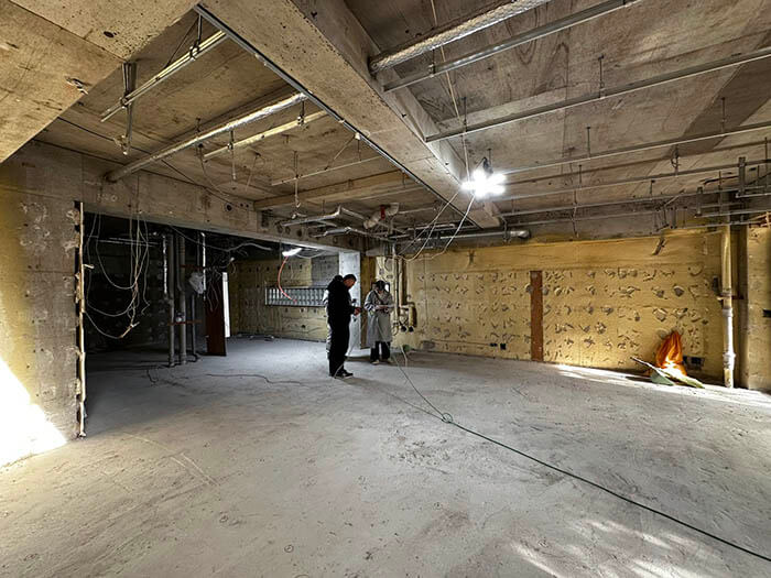 そうなると、今回は騒音の少ないコア抜きからのパッカー工法が使えないので、ハツリ機(電動ハンマー)を使ってのかなりの騒音が発生する工事となりました。中規模のマンションで近隣にお住いの他の住人の方々も皆何らかのリフォーム経験をしている方で、お互いさまということでご理解をしてくださればよいのですが、病気で寝たきりの方がご自宅にいたり、受験の時期だったり、自宅SOHOをしている方がいらっしゃると、日中に出掛けることができず、大きな騒音は勘弁してほしいということになってしまうので、改めてお客さまと工務店でここから3日間の大きな騒音が出る工事のことをマンション内で告知して貰いました。