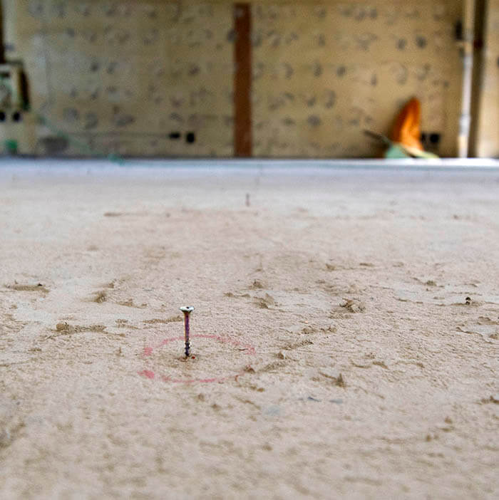工務店青の現場監督補助の川野君が、約1メートル間隔でレベルを出したビスを床スラブに打ってくれました。