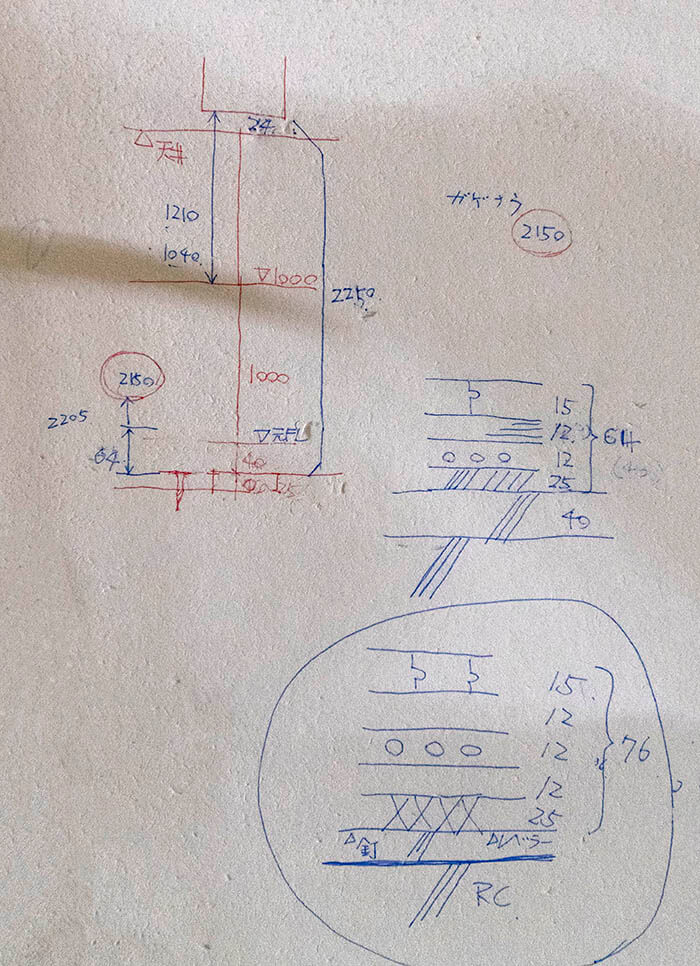 セルフレベラーを25ミリ打つ計算でフラットな床ができるので、そこに25ミリの断熱材、12ミリのベニヤ板、12ミリのガス温水式床暖房マット、12ミリのベニヤ下地の上に15ミリのフローリングを張る計算で、下がり天井部分で2150ミリ天井高さを確保できることが確認できたという訳です。