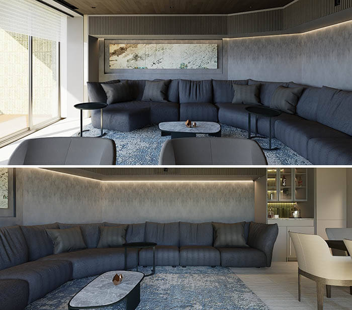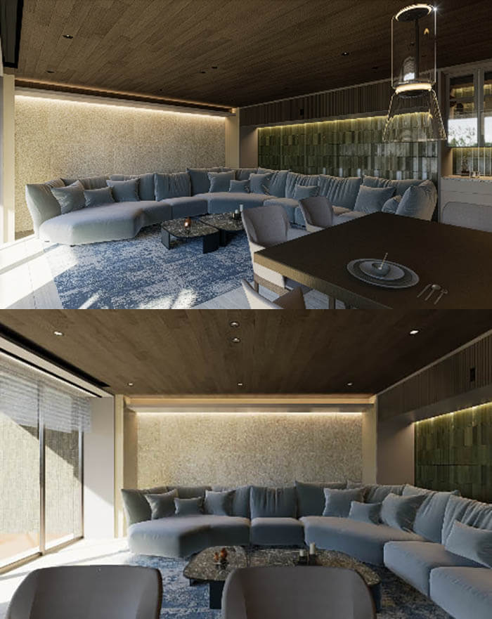 同じマンションのペントハウスにある住戸Aは家族ユースなのに対して、こちらの住戸Bはゲストを呼んで一緒に食事を楽しんで、食後はゆっくりソファで寛いで会話や映画などを楽しみたいというのがこちらのリビングの目的となります。