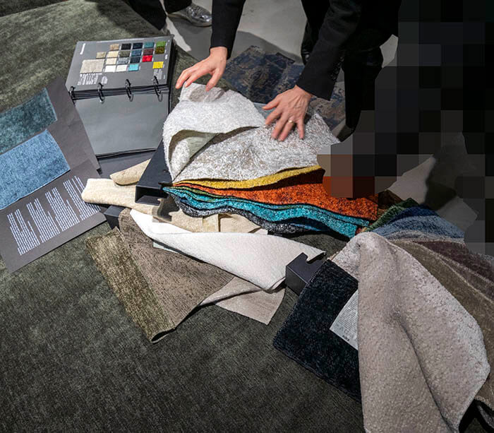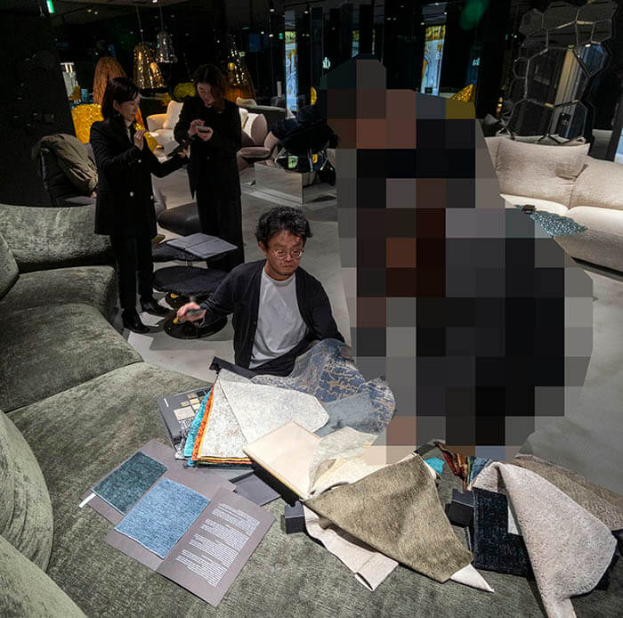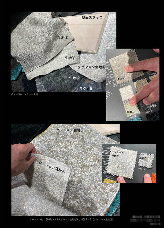ここまでに何度もCGや写真で見てきたソファが、思っていた以上に座り心地も良いことが確認できたので、ほぼこのソファで決まったという流れの中で、張地選びへと移っていきます。