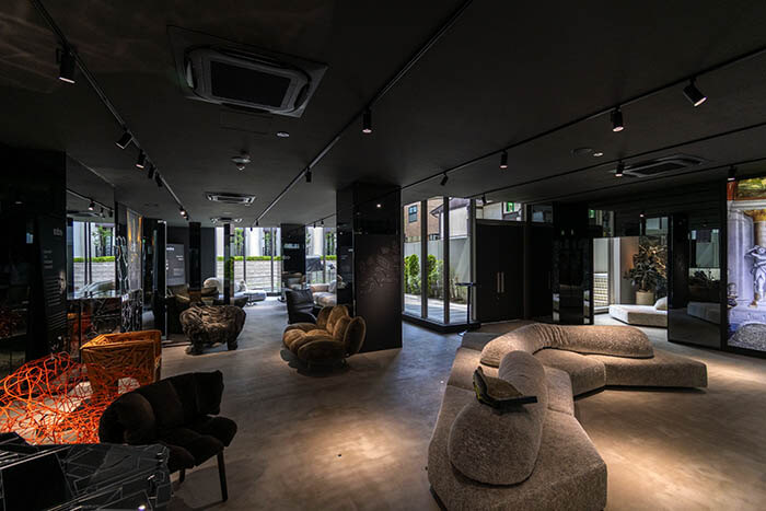 そうこうしているうちに、ようやくエドラの新ショールームがオープンしたとのこと、Rさまご夫妻と一緒に南青山の新ショールームに伺って参りました。左側の鏡壁の前にあるダークグレーのソファが今回選んでいるスタンダードです。