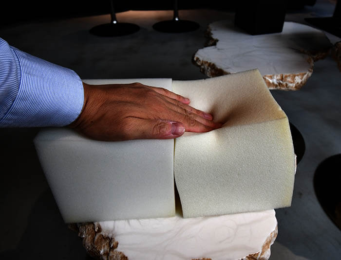 エドラはソファの下地となるウレタンクッションを独自開発しているとのこと、他社が使っているモールドウレタン(左)とオリジナルウレタン(右:特許取得したポリウレタン「Gellyfoam®」)を比較させてもらいました。オリジナルはより深く沈み混むのですが、そこからの復帰がとてもゆっくりで、吸い付くような弾力と、ゆっくりとした復元性がとても印象的なのです。